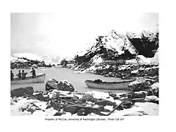 The following morning, 9 January 1910, the party trekked to the top of the cliff above the beach for protection from the high seas and wind, and there they constructed a makeshift tent and fire. The physical state of the men was deteriorating quickly . All of them were frostbitten and some were showing the early signs of hypothermia. For the next 38 hours they stayed on the cliff in a desperate attempt to regain strength. Once the strong winds died down, the men walked two miles (3.2 km) from the cliff and found the camp of Michael Pablow, a fur trapper, who owned his own small schooner. Although Pablow refused to attempt to cross the strait, he supplied the ravenous men with provisions. The group did not leave Pablow’s camp until 7 February 1910 because of intense storms. Albert Bailey and Otto Nelson then led the way to Kaguak on foot while Swanson, Peterson, Bourne, and Weiding followed in a bidarka – a type of skin-covered kayak – because they had lost their ability to walk. The men found an old skiff at Kaguak, dug it out of the snow, and – except for Bourne, was forced to stay with the natives at Kaguak because of physical disability – began making their way across the strait to Kafliar Bay on 12 February 1910. The men were able to reach Cape Ugat on Kodiak Island before a fierce wind once again destroyed their vessel. Fortunately, the party was able to travel on land to the village of Ugansk, but remained stormbound there until 5 March 1910. On 5 March, the people of Ugansk provided the men with a dory, a small flat-bottomed boat. In this, the men reached Afognak. Finally on 11 March 1910, just before midnight, Swanson, Peterson, Nelson, and Bailey were brought into Seward, Alaska, aboard USRC Tahoma, a United States Revenue Cutter Service cutter that had been searching for the men for almost three weeks. Tahoma then retrieved Bourne from Kaguak and Captain Weiding from Kodiak Island, where he had been forced to stay due to hypothermia.[8]