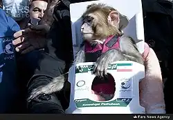 Fargam (Auspicious in Persian) is a male Rhesus macaque monkey launched into space by Iran. The mission was Iran's second successful and third overall attempt at launching a monkey into space; their first attempt in 2011 had failed as the animal died in space. The news was released by Iranian state TV which also showed footage of Fargam strapped inside the rocket. Iranian president Hassan Rouhani congratulated Iranian scientists afterwards, touting it as a "long step in getting the Islamic Republic of Iran closer to sending a man into space".[1]