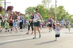 The inaugural Fargo Marathon took place on May 14, 2005,[4][5] and started on the Veterans Memorial Bridge over the Red River between Minnesota and North Dakota. The first year's race weekend offered a 5K on Friday, and a marathon, marathon relay, and a half marathon on Saturday, starting at 8 a.m.[6] Almost 3,000 runners were present for the races, and prize money was offered (including $400 for first place in the marathons).[7] The race drew on local bands for music on the course (25 live bands were at the course in the early years), and local culture was prominent (those years featured a "pasta/lefse feed" for pre-race carbo-loading).[8] The co-director told the press that the racers had raised $20,000 for two local charities: The Children's Museum at Yunker Farm and MeritCare Children's Hospital.[9]