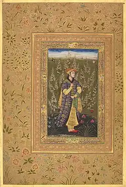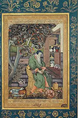 While the exact date of Farrukh's departure for Kabul is not recorded, his tenure under Mirza Muhammad Hakim, half-brother of Mughal Emperor Akbar, has been well documented. While the extent of Farrukh's work for Muhammad Hakim is difficult to gauge due to a lack of illustrations available, two tinted illustrations made under Hakim bear Farrukh's signature, housed in the Gulistan Palace Library in Tehran, Iran.[4] In 1585 at the age of 40, after the death of Mirza Muhammad Hakim, he took his skills to the court of Mughal Emperor Akbar in Mughal India, either in Rawalpindi or Lahore,[4][3][8] where he received his title Beg.[9]