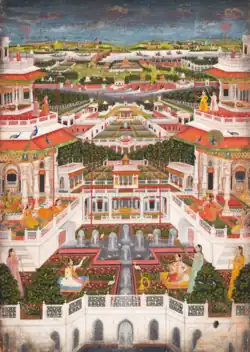 Gulab Bari stands in a garden surrounded by a wall, approachable through two large gateways. These buildings are particularly interesting for their assimilative architectural styles. Shuja-ud-daula's wife was the well known Bahu Begum, who married the Nawab in 1743 and continued to reside in Faizabad, her residence being the Moti-Mahal. Close by at Jawaharbagh lies her Maqbara, where she was buried after her death in 1816. It is considered to be one of the finest buildings of its kind in Avadh, which was built at the cost of three lakh rupees by her chief advisor Darab Ali Khan. A fine view of the city is obtainable from top of the begum's tomb. Bahu Begum was a woman of great distinction and rank, bearing dignity. Most of the Muslim buildings of Faizabad are attributed to her. From the date of Bahu Begum's death in 1815 until the annexation of Avadh, the city of Faizabad gradually fell into decay. The glory of Faizabad finally eclipsed with the shifting of capital from Faizabad to Lucknow by Nawab Asaf-ud-daula.[6]