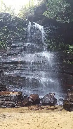 Accessed from a 1.1 kilometres (0.68 mi) track from the entrance point of The South Lawson Waterfall Circuit, it is the furthest falls in the circuit, and the smallest one too.[2] The falls were discovered in the late-1800s, and was named in 1911, originally being called Hay's Cascade.[1] It is a small fall with some rocks at the base, and a beach too.