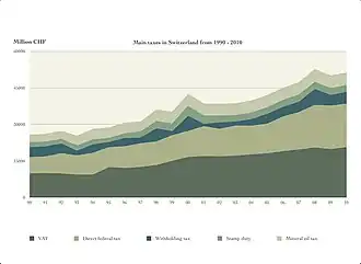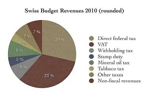 The lion's share of the money the confederation has at its disposal comes from the federal taxes it collects. For the year 2010 92.6% of all the confederations income (a total of 62.833 billion CHF) were gained from tax revenues. The largest part of it, 32.9% came from the value-added tax (VAT). The second most important tax revenue in 2010 was the direct federal tax which contributed 28.5% of the whole budget. Additionally the withholding tax (7.5%), the mineral-oil tax (8.2%), the stamp duty (4.5%) and the tobacco tax (3.7%) as well as other taxes (7.2%) added to the total federal budget.[13]