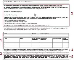 In many cases, the collection of signatures represents an important stage for the committee, which not only counts the 100,000 initials required, but also takes advantage of the campaign to inform the public about the reasons for the initiative and what is at stake.[88] This is usually the first opportunity to inform the general public about the federal popular initiative. The means used to collect signatures are left to the choice of the initiative committee, which has extensive rights to ensure the success of the initiative, while respecting public order and the freedom of others.[89] Frequently used means include press advertisements, mailings, door-to-door collections or meetings; since the early 2000s, the practice of paying people to collect signatures seems to have developed.[90] This practice, unlike that of paying people to sign the initiative, is not illegal.