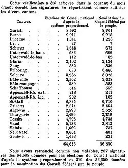 Initially set at 50,000, the number of signatures required for a federal popular initiative came under regular attack from 1922 onwards: no fewer than five interpellations or postulates were tabled calling for an increase until 1972,[40] when the Federal Department of Justice and Police organized a consultation on the subject; the results of this consultation were mixed: while the majority of cantons and major organizations were in favor of increasing the number of signatures, all the political parties in the center and on the left rejected the idea, advocating the status quo.[41] Among the arguments most frequently put forward in favor of increasing the number of signatures were the introduction of women's suffrage (which, coupled with other extensions of the right to vote, reduced the 50,000 signature requirement from 7.6% of the electorate in 1891 to around 1.6% in 1970), the ever-increasing number of federal popular initiatives tabled, and initiatives against foreign overpopulation that some members of parliament deemed "inhumane".[42]