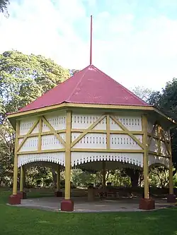 The Federation Pavilion was a temporary structure erected in Centennial Park, Sydney, for use in the celebrations marking the Federation of Australia on 1 January 1901. It was used to swear in Australia's first Governor-General and the first members of the Federal Executive Council, including the first Prime Minister of Australia. The pavilion was originally covered in ornate plasterwork, but the exterior was not preserved and soon fell into disrepair. In 1903, the wooden framework was purchased by the Municipality of Concord and moved to Cabarita Park in the suburb of the Cabarita. The property is now owned by the City of Canada Bay, and was added to the New South Wales State Heritage Register on 22 December 2000.[1] The pavilion has appeared in the clear panel of the Australian five-dollar note since 2016, when the new Next Generation Banknote series went into circulation.[2]