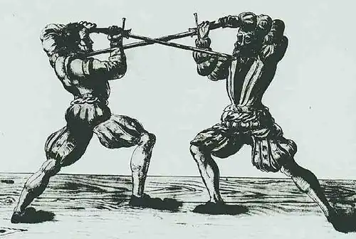 The origin of the term "Feder" for these swords is uncertain. The German word Feder means "feather" or "quill", but came to be used of metal springs in the 17th century (i.e. at about the same time as the name of the sparring weapon and possibly influenced by it). The term Fechtfeder itself seems to be connected to the name of the Federfechter, i.e. "feather fencers", a guild or brotherhood of fencers formed in 1570 in Prague. It is possible that the term Feder for the sparring sword arose in the late 16th century at first as a term of derision of the practice weapon used by the Federfechter (who were so called for unrelated reasons, because of a feather or quill used as their heraldic emblem) by their rivals, the Marx Brothers, who would tease the Federfechter as "fencing with quills" as opposed to with real weapons, or as scholars or academics supposedly better at "fighting with the quill" than at real fighting (reflecting the different professional backgrounds of the rival fencing guilds). Johann Fischart in his Gargantua (1575) already compares the fencing weapon to a "quill" writing in blood.[2] The recharacterized term Federschwert is modern.