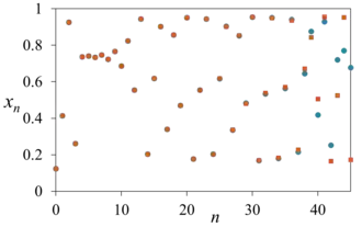 In the field of dynamical systems, this sequence is called an orbit, and the orbit changes depending on the value given to the parameter. When the parameter is changed, the orbit of the logistic map can change in various ways, such as settling on a single value, repeating several values periodically, or showing non-periodic fluctuations known as chaos.[Devaney 1989 1][4]