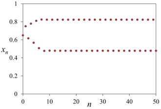 For a type of bifurcation known as a period doubling bifurcation occurs. For , the orbit no longer converges to a single point, but instead alternates between large and small values even after a sufficient amount of time has passed. For example, for , the variable alternates between the values 0.4794... and 0.8236....