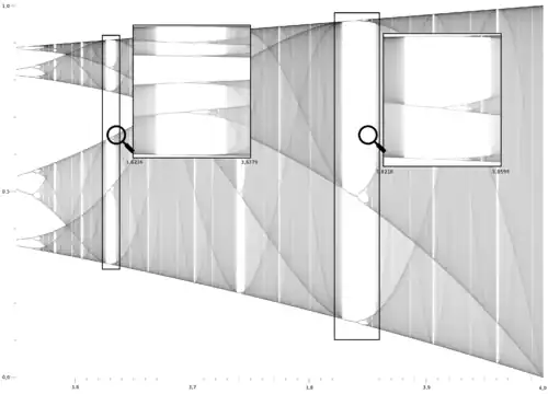 - ^ a b c d Tsuchiya, Takashi; Yamagishi, Daisuke (February 11, 1997). "The Complete Bifurcation Diagram for the Logistic Map". Z. Naturforsch. 52a (6–7): 513–516. Bibcode:1997ZNatA..52..513T. doi:10.1515/zna-1997-6-708. S2CID 101491730.