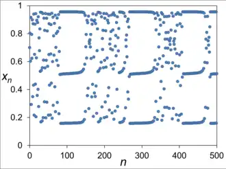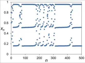 Given an appropriate value for the parameter r and performing calculations starting from an initial condition , we obtain the sequence , , , .... which can be interpreted as a sequence of time steps in the evolution of the system.