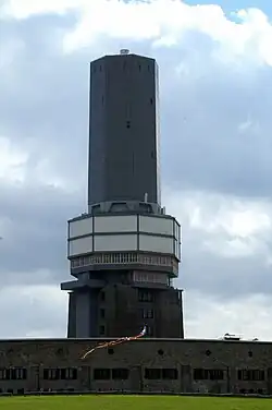 This tower was built in 1937 as a 53-metre-tall (174 ft) reinforced concrete construction with an upper section built of wood. Intended as a television tower for the Rhine Main Area, it became a radar station during World War II. Before the end of World War II, the tower was heavily damaged by bombs, and the structure burned down.