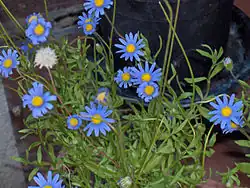 Felicia amelloides is used as an ornamental, both in South Africa and elsewhere. It was introduced to Europe during the eighteenth century and was one of the earliest species in horticulture. It survives some frost provided the soil is well draining, but dislikes moist heat. In hot climates, flowering ceases during summer. In colder climates, it is often treated as an annual, is sheltered in greenhouses or grown as a house plant.[4][6]