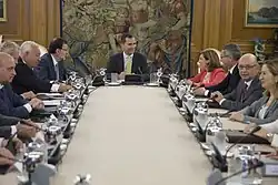 After meeting with political parties represented in parliament,[142] and after verifying that neither Sánchez nor Núñez Feijóo had a sufficient majority to form a government, on 22 August 2023 the king asked the winner of the elections, Alberto Núñez Feijóo, to form a government.[143] As expected, Núñez Feijóo failed to gather enough support to govern and the Congress of Deputies rejected his candidacy.[144] Following new meetings with political parties on early October,[145] the king nominated acting prime minister Pedro Sánchez.[146] After obtaining the support of Sumar and the pro-independence and regionalist political parties, the Congress of Deputies re-elected Sánchez on 16 November 2023[147] and the king swore in the new cabinet on 21 November 2023.[148]