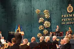 In addition to his official activities, Felipe serves as honorary president of several associations and foundations, such as the Codespa Foundation, which finances economic and social development in Ibero-America and other countries,[14] and the Spanish branch of the Association of European Journalists, comprising outstanding communications professionals. Most noteworthy is the Prince of Asturias Foundation, where he presides annually at the international awards ceremony of the highly prestigious Princess of Asturias Awards (formerly the Prince of Asturias Awards).[54][55]