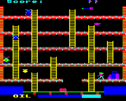 After crossing the conveyor belt, Felix can climb into the rest of the factory which contains a number of randomly placed items which can be picked up and used as well as a number of enemies. The main enemies are the various gremlins that patrol the platforms. If they come into contact with Felix, they knock him off the platform and a life is lost. The other hazard is a giant rat which occasionally runs across the screen, again knocking Felix off the platform (although unlike the gremlins, it can be jumped). Felix can collect a pitchfork which lets him run at the gremlins and knock them from the platforms. This only lasts for a brief time (like the axe in Donkey Kong). There is also a bag of rat poison which can be collected and then laid down on a platform in the hope that the rat will run across that platform. Finally, Felix can collect an oil can which he must take back to the generator. If the can is dropped (by running into a wall or falling on the conveyor belt), it spills and he must return for another can. Only one item can be carried at a time.