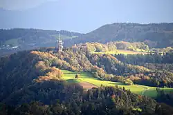 Felsenegg is located some 7 km (4.3 mi) to the southwest of the city of Zürich on the Albis chain, between the municipalities of Stallikon and Adliswil. The hilltop station of Luftseilbahn Adliswil-Felsenegg (LAF for short or commonly called Felseneggbahn) aerial tramway is situated on Felsenegg.[1] The Albis area is one of the most important recreation areas of greater Zürich. The area is mostly wooded, but also has extensive fields, often reaching to the summit, some cultivated, some used as pastures for cows or sheep.