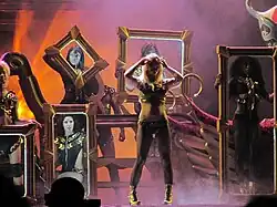 A video interlude in which the stalker talks about femme fatales throughout history introduces the third section of the show. Spears returns to the stage wearing a golden outfit and performs an Egyptian-inspired version of "Gimme More", which includes the use of pyrotechnics. In her next number "(Drop Dead) Beautiful" Spears is surrounded by her dancers carrying picture frames, and includes an appearance by Sabi in select cities. She then sings "He About to Lose Me" on a purple couch while her male dancers climb metallic structures. She wears a golden cape for a snake charming number of "Boys" (The Co-Ed Remix).[34] After climbing into a swing, she starts singing "Don't Let Me Be the Last to Know", while an acrobat hangs from it.[33] Another video interlude follows, featuring Spears changing clothes and choosing between different passports inside a hotel room. The show’s final segment features Spears and her dancers dressed in motorcycle gear to perform a medley of "...Baby One More Time" and "S&M", while her next number "Trouble for Me" features Spears and her dancers performing in the B-stage.[34] Accompanied by her female dancers, Spears performs "I'm a Slave 4 U" with gay soft porn in the backdrops,[35] and subsequently a cover of Madonna's "Burning Up" sitting atop a giant silver guitar.[33] She then brings several fans onstage for a performance of "I Wanna Go". She performs "Womanizer" with her dancers dressed as policemen and thanks the audience.[36] The encore starts with a video interlude of "Scary". The video ends with Spears finally capturing the stalker while wearing a kimono. She reappears to perform a martial arts-inspired version of "Toxic", in which she defeats a group of ninjas. At the end of the song, she goes below the stage and returns wearing a black sparkly bodysuit for "Till the World Ends". Halfway through the performance, Nicki Minaj appears on the backdrops rapping her verse of The Femme Fatale Remix of the song. She also joined Spears to perform the verse in select cities. After the song changes back to the original version, Spears starts flying on a platform with giant angel wings. The show ends with Spears and her dancers thanking the audience, as confetti falls and the "Femme Fatale" sign is lowered onstage.[33]