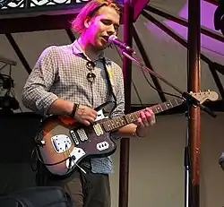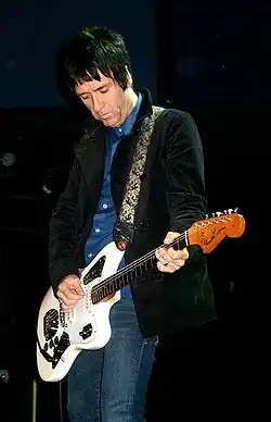 Punk and early new wave guitarists such as Tom Verlaine of the band Television (who can be seen playing a Jaguar on a 2003 album cover)[1] adopted the Jaguar for both contrarian and economic reasons; its lack of mainstream use made it both a style statement and less expensive than guitars of comparable quality.[6] In the 1990s the popularity of the Jaguar and Jazzmaster exploded after they were used by guitarists such as Scott Hill, John Squire,[7] Kurt Cobain (for whom a signature model was introduced),[8] Kevin Shields, Black Francis, J Mascis, Brian Molko, Rowland S. Howard,[9] Thurston Moore, John Frusciante, Will Sergeant[10] and Johnny Marr (who has a signature model).[11] Despite this, Jaguars still fetch considerably less than Telecasters and Stratocasters of similar vintage.[2]