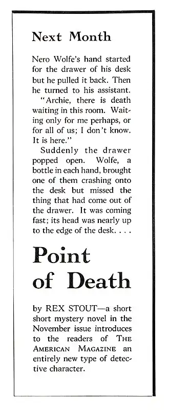 - ^ a b Townsend, Guy M.; McAleer, John J.; Sapp, Judson C.; Schemer, Arriean, eds. (1980). Rex Stout: An Annotated Primary and Secondary Bibliography. New York and London: Garland Publishing, Inc. pp. 7–8. ISBN 0-8240-9479-4.