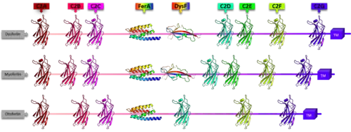 Ferlins are type II transmembrane proteins (N-terminus on the cytoplasmic side of the membrane) and contain five to seven C2 domains linked in tandem and have a single-pass transmembrane domain located at the C-terminus.[3] The C2 domains are denoted in order from amino-terminus to carboxyl-terminus as C2A to C2G. C2 domains are essentially calcium and phospholipid binding domains, evolved for cell membrane interactions. In fact, many proteins involved in signal transduction, membrane trafficking, and membrane fusion employ C2 domains to target the cell membrane. However, ferlins are unique for containing more C2 domains than any other proteins (between five and seven).[4] FerA and DysF are two intermediate domains that are unique to ferlins. There is less known about FerA and DysF domains, however, mutations of these domains in dysferlin can also lead to muscular dystrophy.[5][6]