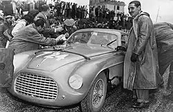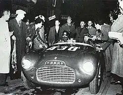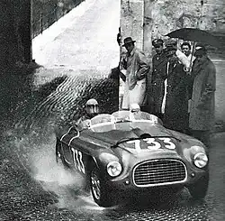 The first success came at the 1950 Mille Miglia, where Giannino Marzotto and Marco Crosara drove their berlinetta to a victory.[13] In spite of a bad weather, Marzotto was reported to be wearing a double breasted suit and tie.[14] The winners average speed was 123.5 km/h.[15] Giannino was the youngest Mille Miglia winner to date at only 22. The second place also went to the 195 S but in a barchetta form, driven by Dorino Serafini and Ettore Salani.[16] Vittorio Marzotto and Paolo Fontana drove a Fontana Barchetta to a ninth place overall and sixth in S+2.0 class. All three cars were entered by Scuderia Ferrari.[8] Later the same year, three 195s finished Coppa della Toscana race around Tuscany.[17] This time around Serafini and Salani won in a barchetta at an average speed of 127.7 km/h.[16] Franco Cornacchia with Del Carlo were second, driving the same berlinetta that was victorious at Mille Miglia.[15] Another barchetta finished seventh overall, driven by Elio Checcacci aided by Dal Preda.[18] Giannino Marzotto also won the 3 Hours of Rome race also known as Notturne della Caracalla.[19]