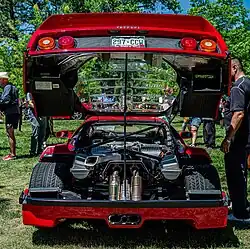 Power came from an enlarged, high-revving 2,936 cc (2.9 L; 179.2 cu in) version of the 288 GTO's four-stroke 90 degrees twin turbocharged and intercooled V8 engine generating a peak power output of 478 PS (471 hp; 352 kW) at 7,000 rpm and 577 N⋅m (426 lb⋅ft) of torque at 4,000 rpm as stated by the manufacturer.[1] Gearing, torque curves, and actual power output differed among the cars. The F40 did without a catalytic converter until 1990, when US regulations made them a requirement for emissions control reasons. The flanking exhaust pipes guide exhaust gases from each bank of cylinders while the central pipe guides gases released from the wastegate of the turbochargers. The F40's twin-turbocharged V8 would be Ferrari's final forced induction engine until the California T in 2014.