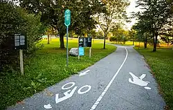 The east side of Ferry Point Park is equipped with sports fields, basketball and handball courts.[24] The west side has barbecue areas, 8 soccer fields, 2 cricket fields, 9/11 Living Memorial Forest and Hilltop Grove. By 2023 there were new plantings, drainage, new electric, and a ferry dock with a small bus that brings commuters from the reconstructed parking Lot. The park includes a baseball field, basketball court, playground, trails and comfort station. The waterfront promenade has a main shared trail. A 40-foot (12 m) hill and some shorter ones block the golf course from view. There has been ecological revitalization of the waterfront on the east side near the East River Crescent area. [25][3]