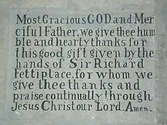 Two Fettiplace monuments survive in St Thomas' Church, East Shefford. One is a mid-15th century altar tomb made of alabaster, featuring recumbent effigies of Sir Thomas Fettiplace and his Portuguese wife Beatrix. The second is a memorial brass for John Fettiplace (d. 1524) and his wife Dorothy Danvers, featuring family coats of arms, including those of Fettiplace impaling Danvers, and representations of a number of children.[6]