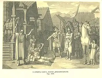 ![]() The Death of Oleg, Prince of Dereva (1836). Drawing made by Taras Shevchenko. | |||||||