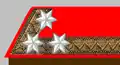 The rank insignia was a gorget patch on the stand-up collar of the so-called Waffenrock (en: tunic), and consisted of three white stars on 13 mm ragged yellow silk galloon. The gorget patch and the stand-up collar showed the particular Waffenfarbe (en: corps colour).
