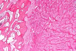 | Micrograph showing fibrous dysplasia with the characteristic thin, irregular bony trabeculae and fibrotic marrow space. H&E stain. | |