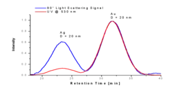 Centrifugal FFF has the advantage that particles and macromolecules can be separated by particle density, rather than just particle size. In this instance, two identically sized gold and silver nanoparticles can be separated into two peaks, according to differences in density in the gold and silver nanoparticles,
