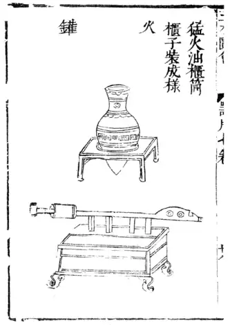 In 1126 AD, the Song dynasty used flamethrowers in an attempt to prevent the Jurchen Jin dynasty army from crossing the Yellow River.[8] Illustrations and descriptions of mobile flamethrowers on four-wheel push carts were documented in the Wujing Zongyao, written in 1044 AD (its illustration redrawn in 1601 as well).