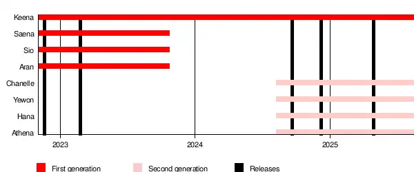 Originally debuting as a four-member group, the lineup changed following a legal dispute between members and their agency. After a court dismissed a request to suspend their exclusive contracts, Attrakt terminated the contracts of Saena, Aran, and Sio, and later filed a lawsuit citing breach of contract and other claims. In 2024, the group relaunched with a new lineup: Chanelle Moon, Yewon, Hana, and Athena. Keena, the only remaining original member, continued her activities with the reorganized group.