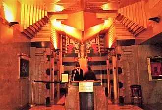 Additional doors from the vestibule lead to the lobby, which has a gray wall and a multicolored floor with gray, ochre, and pink. A plaster band wraps around the ceiling and side walls of the lobby, similarly to in the entrance vestibule, and the decorations of the floors direct visitors to the elevators.[18][20] The lobby may have been designed by Engelbartus van der Woord, who worked for Kahn's firm.[21] The lobby contains various three-dimensional decorations related to theater, such as camera motifs and triangular projections.[22][23] Where the main lobby intersects with a smaller elevator lobby, the wall has reliefs that resemble movie cameras,[17][18][24] which reference the edifice's original purpose as an ancillary building for Times Square's film industry.[13] There are several projecting red cylinders on the corners of the walls between the elevator lobby and main lobby.[17][18][24] In addition, the lobby contains orange, yellow, and blue mosaics.[17]