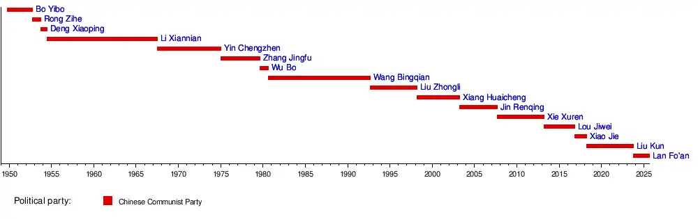 | 1 | | Bo Yibo 薄一波 (1908–2007) | 19 October 1949 | 18 September 1953 | 3 years, 334 days | Member of the Central People's Government Deputy Director of the Finance and Economics Committee of the Central People's Government First Secretary of the North China Central Bureau of the Chinese Communist Party Director of the National Organization Committee Director of the Central People's Government's Economy Inspection Committee | Zhou Enlai | [7] |