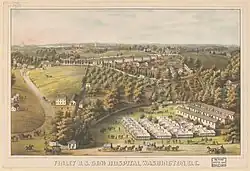 A confirmed illustration of Finley Hospital (lithography) from 1864 shows the Capitol Building and the Washington Monument.[7]