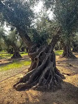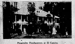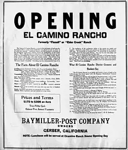 El Camino was laid out as a residential subdivision of 20-acre tracts in 1920.[13][14] As of 1923, developers claimed that 800 families from southern California and Idaho would soon be moving into the land, which was 8,000 acres (3,200 ha) of the Mexican-era land grant.[15] Twelve houses were under construction and residents were raising cherries, apricots, plums, grapes, and olives.[15] Prune plums were a major product of the district in 1928.[16]