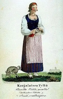 Karelians are known as hospitable and playful; a stereotype in large part created by Zacharias Topelius in his book Maamme kirja (1875). Before this, the stereotype of Karelians described them as close-minded and lazy.[11] Karelia is also often known as the home of poetry[6] and song, which is also reflected in the regional song of Finnish Karelia, Karjalaisten laulu , lit. 'Song of the Karelians'. Karelians have faced multiple hardships in history while developing a strong sense of identity. As a result the evacuations in the 1940s, they also live in a diaspora across Finland. Due these factors, some, such as journalist Ilkka Malmberg and author Heikki Hietamies, have referred to Karelians as the "Jews of Finland".[11][12] A study conducted by Suomen kulttuurirahasto and e2 in 2018 shows that 36% of those identifying as Karelians in Finland are not from Karelia, a percentage way higher than the equivalents with any other heimo. These descendants of the evacuees living in other parts of Finland still hold a connection to the Karelian identity through their families. Being Karelian was also the most popular "secondary heimo identity" in the country, which shows how widespread the Karelian identity is in Finland. Due to this, being Karelian has also been described as first and foremost a mental state.[13] Karelians also often organize different events and celebrations for the Karelian identity, a custom which has become increasingly rare for any other heimo.[14]