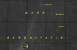 Finsch is a relatively small lunar impact crater in the mid-part of Mare Serenitatis that has been almost completely (other than the crest of the rim) covered by the mare, forming a ghost crater in the lava plain. It was named after German zoologist Otto Finsch.[1] It is located to the south-southeast of the crater Sarabhai and northeast of Bessel.