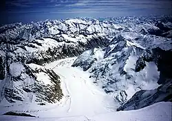 The first ascent was long a controversial matter. The first attempt was made on 16 August 1812 by the Aargau merchant Rudolph Meyer, guided by the locals Kaspar Huber, Arnold Abbühl, Joseph Bortes and Aloys Volker. Bortes and Volker, guiding Meyer's father and uncle, had been the first to climb the Jungfrau the previous year. They approached the mountain via the Oberaarjoch, Studer glacier, and south-east ridge, which is a more difficult and longer route than the current normal route over the north-west ridge. Meyer became exhausted and remained behind after reaching the ridge, perhaps near P. 3883 (Meyer's Peak).[3] Huber kept him company, while the three other guides went on and purportedly reached the summit after three hours.[3][4]