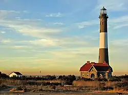 The Fire Island Lighthouse is a visible landmark on the Great South Bay, in southern Suffolk County, New York on the western end of Fire Island, a barrier island off the southern coast of Long Island.[4][5] The lighthouse is located within Fire Island National Seashore and just to the east of Robert Moses State Park. It is part of the Fire Island Light Station which contains the light, keepers quarters, the lens building containing the original first-order Fresnel lens, and a boat house.