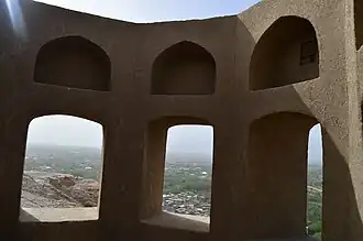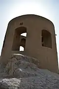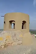 Another feature of the complex are the remains of a tower-like circular building on the very top of the same hill. This structure, which was once at least twenty meters high, is known by the local populace as the Burj-i Gurban, or Burj-i Kurban,[6] "Tower of Sacrifice," and appears to have been a military watch-tower with a flare that could be lit to warn of an approaching enemy (i.e. a beacon).[5]