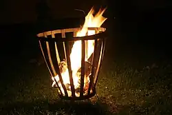 A fire basket is an iron basket in which wood can be burned to make a bonfire. Fire baskets have been used since antiquity mainly to illuminate and heat rooms.[1] Today, they are most often used in an outdoor garden area as an outdoor heater or grill. The fire basket primarily is used to contain firewood, or another fuel, and is meant to offer fire protection.[2]