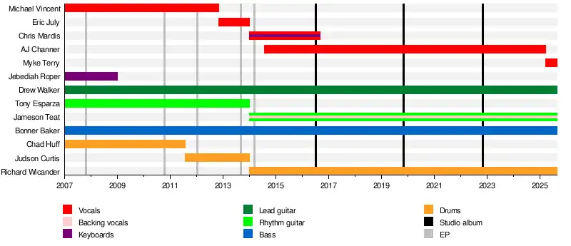 In 2013, Judson Curtis replaced Chad Huff on drums in time for the Sweet Lasting Revenge EP and Michael Vincent would be replaced on vocals by Eric July for Politically Incorrect EP (2013). At the end of 2013, Jameson Teat and Richard Wicander replaced Tony Esparza and Judson Curtis on rhythm guitar and drums respectively. Chris Mardis was originally hired as a fill-in vocalist after departure of Eric July at this same time, but then stayed onboard when the band officially added A.J. Channer in 2014.[8]