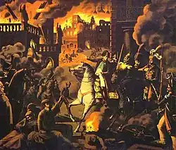 During the French occupation of Moscow, a fire persisted from 14 to 18 September 1812 and all but destroyed the city. The Russian troops and most of the remaining civilians had abandoned the city on 14 September 1812 just ahead of French Emperor Napoleon's troops entering the city after the Battle of Borodino.[2][3][4] The Moscow military governor, Count Fyodor Rostopchin, has often been considered responsible for organising the destruction of the former capital to weaken the French army in the scorched city even more.[5][6][7]