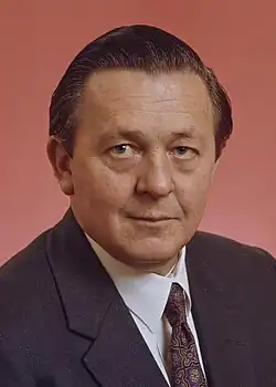 The first Fraser ministry (Liberal–National Country coalition) was the 50th ministry of the Government of Australia. It was led by Prime Minister, Malcolm Fraser. The first Fraser ministry succeeded the Third Whitlam ministry, which dissolved on 11 November following the dismissal of the Whitlam government by Governor-General Sir John Kerr. As such, it was a caretaker ministry until a federal election could take place.[1] To date, it is the last ministry not to be split between a Cabinet and outer ministry. In the event, the Coalition was ultimately elected on 13 December 1975, and this ministry was replaced by the second Fraser ministry on 22 December 1975.[2]