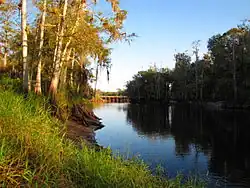 Fisheating Creek flows through a landscape of prairies, both dry and wet, flatwoods, freshwater marshes, hammocks, bottomland forests, and floodplain swamps. Human activity has introduced improved pastures, and eucalyptus and pine plantations.[11] In 1842 Fisheating Creek was described as a large stream in the dry season, varying in width from a river to a brook, and very "tortuous".[12] Lake Okeechobee has been artificially maintained at a lower level than prevailed before the 20th century, with the result that much of Cowbone Marsh has been drained and converted to agricultural land.[6] Lake Okeechobee has been almost completely enclosed by the Herbert Hoover Dike. The only gap in the dike is at Fisheating Creek, where the dike turns inland and parallels the stream on both sides for several miles, leaving Fisheating Creek as the only remaining free-flowing tributary of Lake Okeechobee.[4][13] The Lake Okeechobee Scenic Trail runs across the Herbert Hoover Dike.
