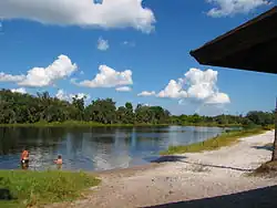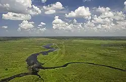 The name Fisheating Creek is derived from the Seminole name for the stream recorded on a military map of 1839,[2] Thlothlopopka-Hatchee, which is translated as "the river where fish are eaten".[3] Fisheating Creek is between 40 miles (64 km)[4] and 51 miles (82 km)[5] long. It flows southward through an area called the Cypress Swamp in the southwestern part of Highlands County and into Glades County, where it turns eastward about 1 mile (1.6 km) north of County Road 731 and flows about 30 miles (48 km) to Lake Okeechobee. The stream spreads out into Cowbone Marsh for the last 8 miles (13 km) before entering the lake.[6] Fisheating Creek is the second-largest natural source of water for Lake Okeechobee (behind the Kissimmee River), supplying close to 9% of the water flowing into the lake.[7][8]